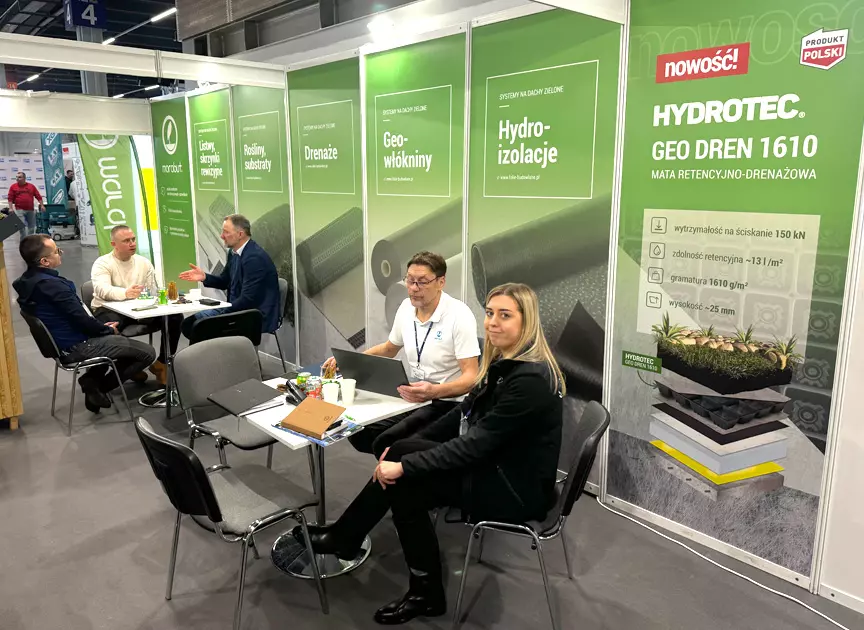 Sercem naszych systemów są wysokiej jakości maty drenażowe Hydrotec. To właśnie one odpowiadają za efektywne odprowadzanie nadmiaru wody, przy jednoczesnym zapewnieniu odpowiedniej retencji dla roślinności. Mieliśmy zaszczyt zaprezentować naszą nowość geokompozyt retencyjno-drenażowy HYDROTEC Geo Dren 1610, który pozwala zgromadzić zapas wody o pojemności nominalnej do 13 l/m2.Oprócz mat zaprezentowaliśmy szeroką gamę akcesoriów na zielony dach, między innymi listwy separacyjne i listwy krawędziowe, geowłókniny filtracyjne, skrzynki rewizyjne oraz całą gamę roślinności na dach zielony.