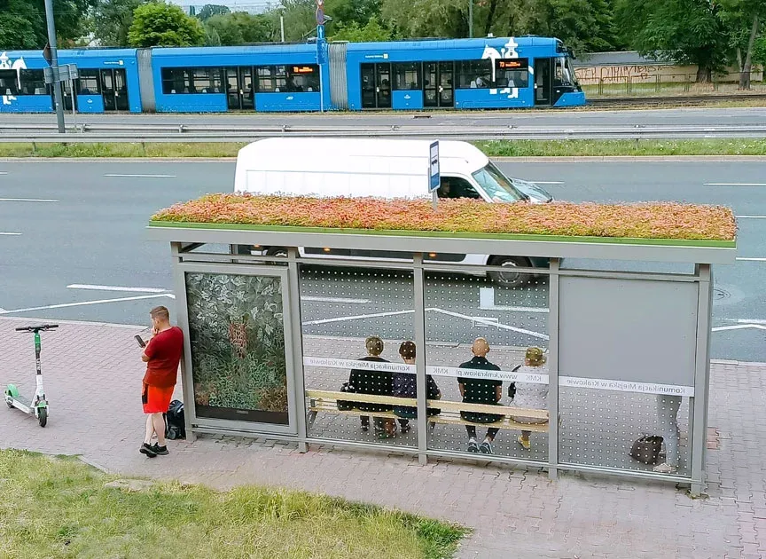 Interesujący przykład praktycznego zastosowania dachu zielonego można zaobserwować na przystankach komunikacji miejskiej w Krakowie. Na zielony wiaty przystankowe montuje się ekstensywne dachy zielone obsadzone rozchodnikami — roślinami odpornymi na zmienne warunki pogodowe, które jednocześnie wspierają bioróżnorodność i są przyjazne dla dzikiej fauny, np. ptaków i pszczół. W praktyce taki dach zielony na przystanku działa jako naturalna izolacja akustyczna, zatrzymuje pyły z powietrza, magazynuje wodę nawet do 150 litrów. Sprawdź nasz artykuł Dach zielony na krakowskich przystankach MPK